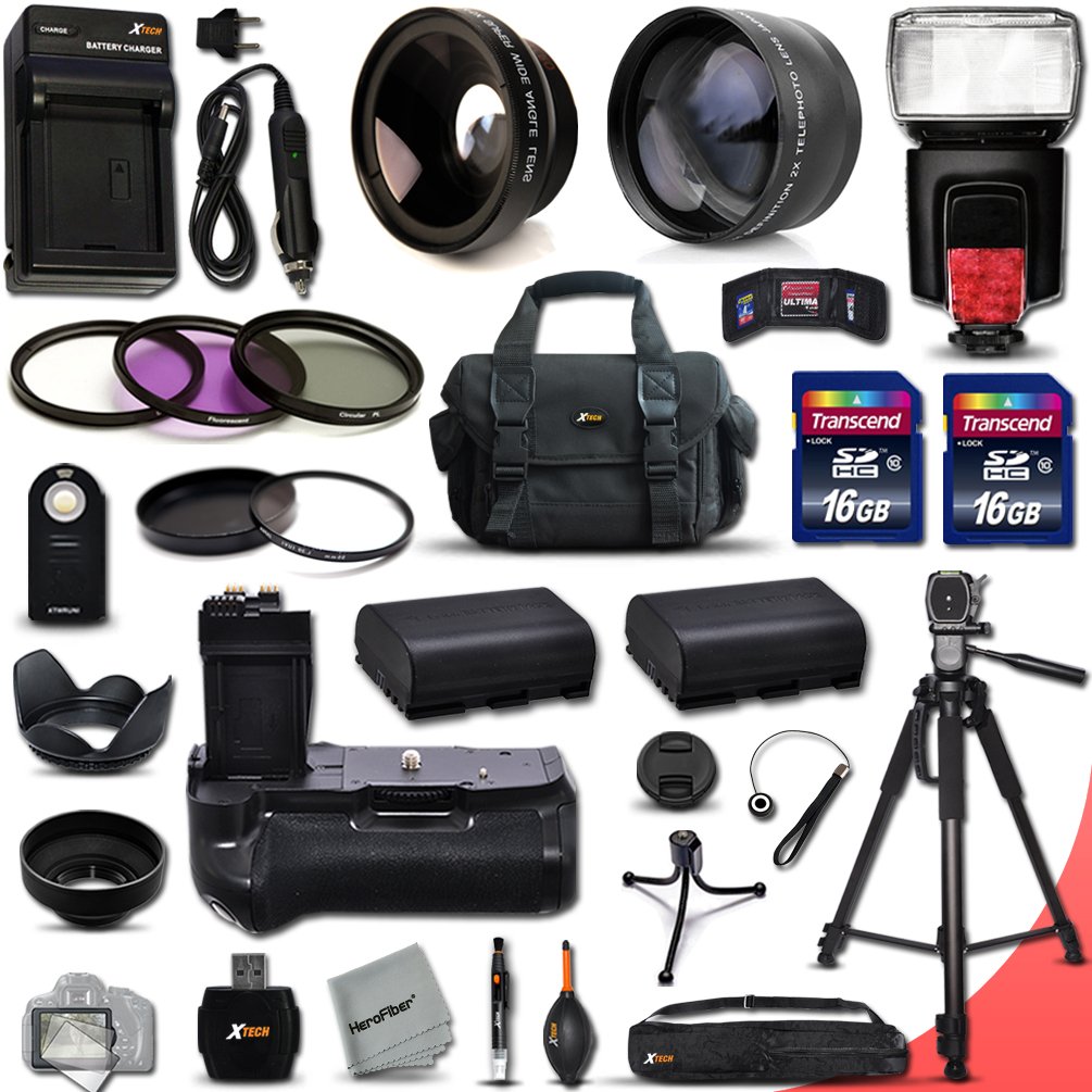 Includes a Pro External Flash, Multi Power Battery Grip + 2 High Capacity LP-E6 LPE6 Batteries 2750mAh (each) and AC/DC Quick Charger, plus 2 16GB High-speed Memory Cards (32GB total) plus Universal Card Reader and Memory Case Holder.